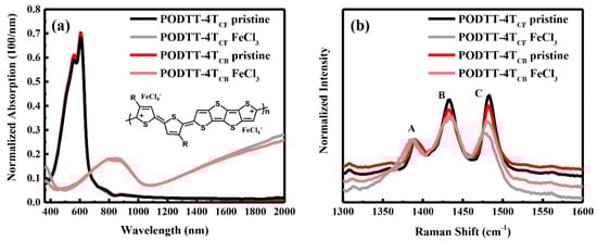 (a) The thickness-normalized absorption spectra; (b) Raman spectra of pristine and doped films drop casted from CF and CB, respectively. The Raman intensity is normalized on the band peaked at mode A.