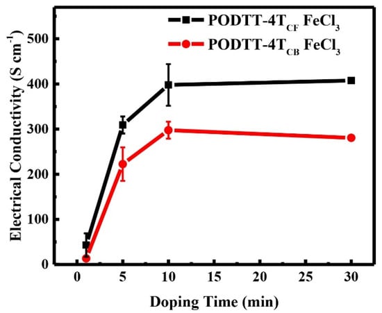 Electrical conductivities of PODTT-4TCF (black line) and PODTT-4TCB (red line) doped by FeCl3 as a function of the doping time.