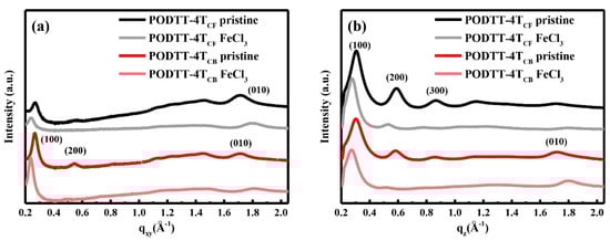 To further understand the relationship between solvent-dependent morphology and charge transport properties, grazing-incidence wide-angle X-ray scattering (GIWAXS) was performed (Figure 3 and Figure S7). Pristine PODTT-4TCF film shows intense (h00) multi-order diffraction peaks in the out-of-plane direction (along the qz direction) and a (010) diffraction peak at qxy = 1.6–1.8 Å−1 generated by π-π stacking in the in-plane direction. That indicates a dominantly edge-on orientation existing in PODTT-4TCF film [30,31]. In contrast, pristine PODTT-4TCB film shows weak and broad Debye rings of (h00) peaks with a (010) diffraction peak appearing both in the out-of-plane and in-plane directions, meaning that both edge-on and face-on orientation exists in the PODTT-4TCB film. Since CF and CB have different boiling points, the difference of molecular orientations from two solvents can be attributed to the evaporation rate of solvent during the film preparation. In addition, the face-on orientation is thermodynamically stable packing for the polymer. The lamellar distance and π-π stacking distance of the PODTT-4TCF film are 20.26 Å and 3.67 Å, while the distances are 20.93 Å and 3.67 Å for PODTT-4TCB film, respectively. (Table S4). These results demonstrate that the utility of solvent mainly affects the packing orientation in pristine films and has a negligible effect on the lamellar distance and π-π stacking distance. Upon doping by FeCl3, the lamellar stacking distance of PODTT-4TCF film is increased to 22.43 Å (Δd100 = 2.17 Å), while the π-π stacking distance decreases to 3.50 Å (Δd010 = −0.17 Å). For the PODTT-4TCB film, the lamellar packing distance is increased to 23.26 Å (Δd100 = 2.33 Å) while the π-π stacking distance also decreases from 3.67 to 3.50 Å (Δd010 = −0.17 Å). These results indicate that the dopants prefer to intercalate into the lamellar alkyl side-chain region without disturbing the intense π-π stacking attributed to the electronic coupling between the conjugated backbone. Moreover, the molecular orientations of pristine films are still maintained upon doping. The size of the crystalline grain of pristine and doped films is compared by extracting the data of the full-width at half-maximum (FWHM) of (100) peaks according to the Scherrer equation [32,33]. It is observed that the FWHM of pristine PODTT-4TCF film (0.072 Å−1) is slightly smaller than that of pristine PODTT-4TCB film (0.078 Å−1), indicating larger crystalline domains in the pristine PODTT-4TCF film. Upon doping, the crystalline domains of doped films are significantly increased. In addition, the crystalline size of doped PODTT-4TCF film is still much larger than that of doped PODTT-4TCB film.