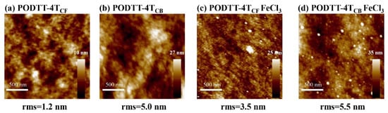 AFM height images of (a) pristine PODTT-4TCF film, (b) pristine PODTT-4TCB film, (c) doped PODTT-4TCF film, and (d) doped PODTT-4TCB film.