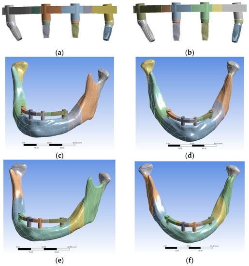 - Wu, A.Y.-J.; Hsu, J.-T.; Fuh, L.-J.; Huang, H.-L. Biomechanical effect of implant design on four implants supportingmandibular full-arch fixed dentures: In vitro test and finite element analysis. J. Formos. Med. Assoc. 2020, 119, 1514–1523. [Google Scholar] [CrossRef]