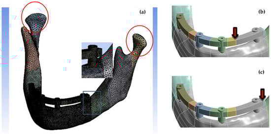 (a) The finite element model; the red circles represent the regions of boundary condition. (b) Loading condition A and (c) Loading condition B are shown.
