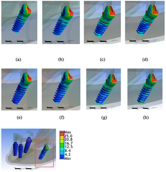 Dental implant with a high stress distribution in (a) Model 1, (b) Model 2, (c) Model 3, (d) Model 4, (e) Model 5, (f) Model 6, (g) Model 7, (h) Model 8.