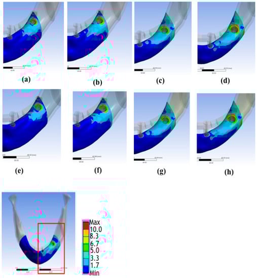 Distributions of von Mises stresses in the cortical bone in (a) Model 1, (b) Model 2, (c) Model 3, (d) Model 4, (e) Model 5, (f) Model 6, (g) Model 7, (h) Model 8.