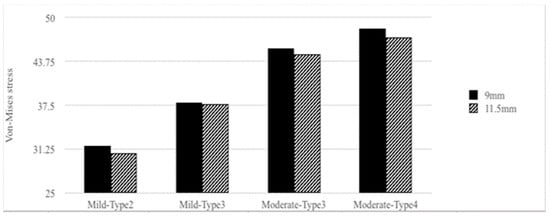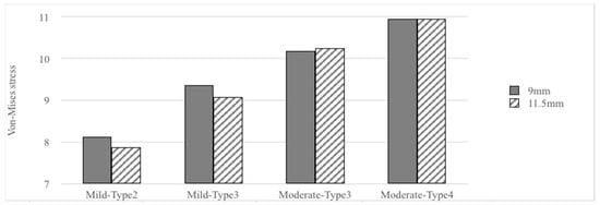 When focusing on stresses in the surrounding cortical bone with bone quality change, mild type 3 was 19.42% higher than mild type 2 in the 9 mm implant length group under loading condition B. Furthermore, moderate type 4 was 6.08% higher than moderate type 3. Similarly, mild type 3 was 22.59% higher than moderate type 3 in the 11.5 mm implant length group under loading condition B. Further, moderate type 4 was 5.35% higher than moderate type 3. Therefore, if the bone quality decreased, the von Mises stresses increased (type 2 < type 3 < type 4).