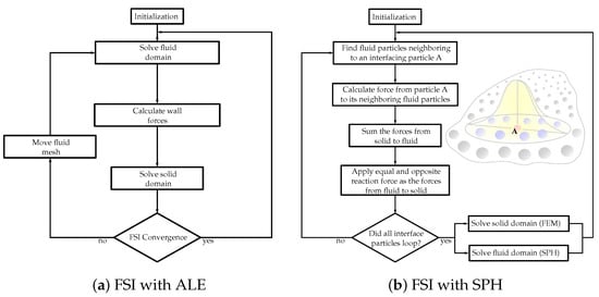 Flowcharts of the FSI solution algorithms with (a) arbitrary Lagrangian–Eulerian (ALE) and (b) smoothed-particle hydrodynamics (SPH) methods.