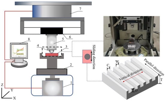 Schematic diagram of the test setup: (1) rotary motor, (2) sample table, (3) block specimen, (4) ball specimen, (5) ball holder, (6) suspension, (7) 2-D strain-gauge force sensor, (8) computer.