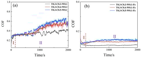 Friction coefficient curves of (a) Mn-Cu and (b) Fe-Zn samples with different center distance weavings.
