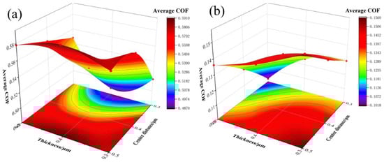Figure 3 shows the effect of the sample thickness and fabric center distance on the average friction coefficient of the sample. (The effect of sample thickness and fabric center distance on the average friction coefficient of the sample is investigated in Figure 3) The friction coefficient of the Mn-Cu samples increases with the increase in the center distance when the sample thickness is constant. The change of friction coefficient is influenced by both the sample thickness and weave center distance when the sample thickness increases. The friction coefficient of the Fe-Zn samples decreases with the increase in the sample thickness, and the friction coefficient increases as the center distance becomes larger when the thickness is constant. When the sample thickness increases, the change of center distance has a greater effect on the friction coefficient. This difference may originate from the variation of the contact state of the friction pair, the change of the weave parameters affecting the contact area, the contact strength, and the contact damping under dynamic tangential forces.