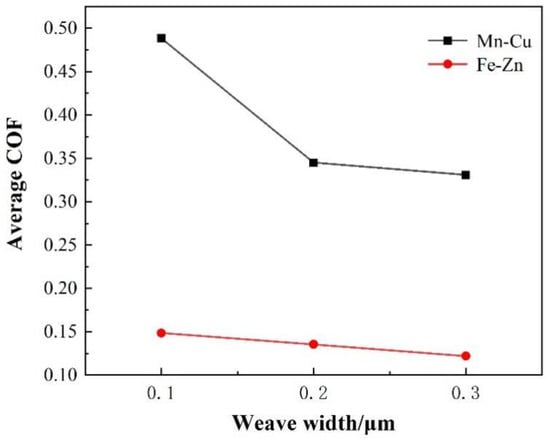 Apart from the effect of thickness, Figure 4 shows that the average friction coefficient is influenced by the weave width. The average friction coefficient increases with the increase in the weave width when the thickness of all samples is identical. There is a difference in the friction coefficients of the Mn-Cu samples and Fe-Zn samples. The average friction coefficient of the Fe-Zn and Mn-Cu samples and the sample with the narrowest weave width are about 0.15, 0.3 and 0.46, respectively.