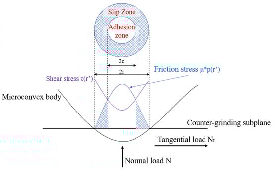 To investigate the effect of contact characteristics on the coefficient of friction, according to the theory of micro-convex deformation, the micro-convex body underwent three stages during the friction process, namely plastic deformation, elasto-plastic deformation, and plastic deformation [36,37,38]. When the dry friction exists between the contact surfaces, the normal stress at the contact ring boundary is small, and the shear stress tends to infinity (Figure 5). Tangential loads of any size cause the boundary of the contact zone to slide. When the tangential load is less than the maximum static friction, the contact area of a single contact point is divided into adhesion zone and slip zone. The shear deformation has a complete slip under the friction conditions mentioned in this work, but the numerical simulation results are inaccurate when the deformation is large. Therefore, only the force conditions between test and before complete slip are considered to conduct the subsequent finite element simulations [39,40].