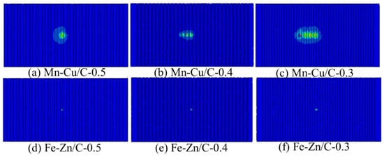The relationship between the friction coefficient and the tangential damping during the friction process is obtained by finite element modeling (Figure 6, The normal force is 2 N, the sample thickness is 0.3 μm, and the weave width is 0.1 μm). The tangential force of the Mn-Cu sample is higher, while the contact mode of the Fe-Zn sample is mainly pointing contact and its tangential force is lower, resulting in the lower friction force and friction coefficient of the Fe-Zn samples.