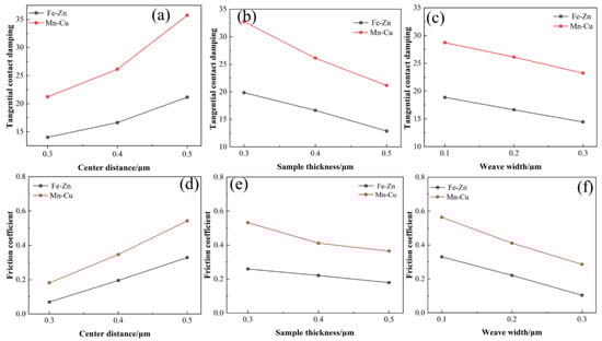 Tangential contact damping of the samples. (a) The relationship between Tangential contact damping and center distance. (b) The relationship between Tangential contact damping and Sample thickness. (c) The relationship between tangential contact damping and weave width. (d) The relationship between Friction coefficient and center distance. (e) The relationship between Friction coefficient and Sample thickness. (f) The relationship between Friction coefficient and Weave wideth.