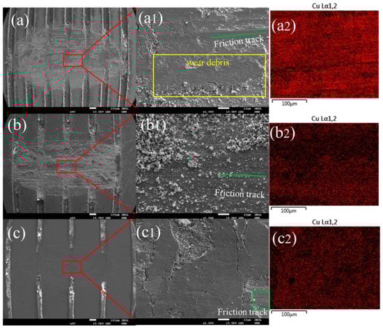 SEM images and Cu elemental mappings of the worn surfaces of Mn-Cu samples (T0.3-W0.1-N2 group). (a) The sample with a center distance of 0.3 μm. (b) Shows the sample with a center distance of 0.4 μm. (c) Shows the sample with a center distance of 0.5 μm. (a1) Partial enlargement of a-graph. (b1) Partial enlargement of a-graph. (c1) Partial enlargement of c-graph. (a2,b2,c2) Copper contents different friction surfaces.