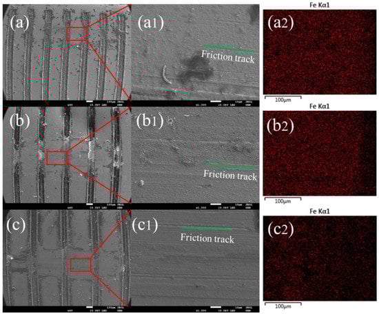 Elemental mapping of Fe on the worn surfaces of Fe-Zn samples (T0.3-W0.1-N2-Fe group). (a) The sample with a center distance of 0.3 μm. (b) The sample with a center distance of 0.4 μm. (c) The sample with a center distance of 0.5 μm. (a1) Partial enlargement of a-graph. (b1) Partial enlargement of a-graph. (c1) Partial enlargement of c-graph. (a2,b2,c2) Iron contents different friction surfaces.