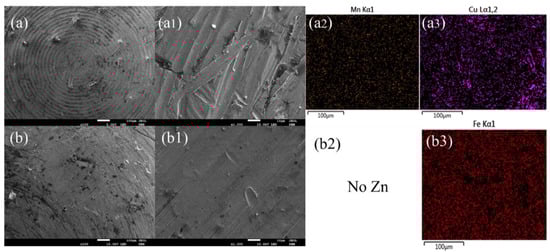 Elemental mapping of Mn, Cu, Fe, Zn on the worn surfaces of counterfaces. (a,b,a1,b1) Morphology and atomic distribution of grinding ball. (a2) Enlarged view of the surface of manganese containing material. (a3) Enlarged view of copper containing material surface. (b2) Enlarged view of zinc free material surface. (b3) Enlarged view of ferrous material surface.