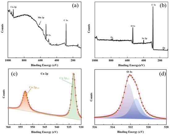 XPS spectrum of sample Mn-Cu (a) and Fe-Zn (b), Cu 2p (c) of Mn-Cu sample and O 1s (d) of Mn-Cu sample.