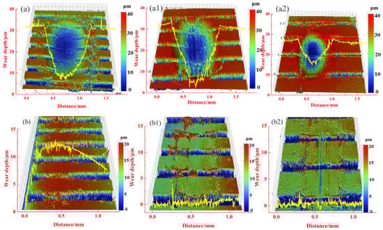 Figure 13 shows the abrasion mark morphologies and wear cross-section of the Mn-Cu and Fe-Zn samples under a normal force of 2 N. The wear depth and volume of the Mn-Cu sample decreased with the increase in the weave center distance, and the cross-section shows a U-shape. The height of the edge of the abrasion marks is higher than that of the surface of the Mn-Cu sample, which indicates the accumulation of abrasive chips. The surface wear of the Fe-Zn sample is slight, and there is a small accumulation of abrasive chips at the edge of the abrasion marks and a more obvious scratch at the center of the abrasion marks (Figure 13(b1,b2)), which is a typical feature of abrasive wear.