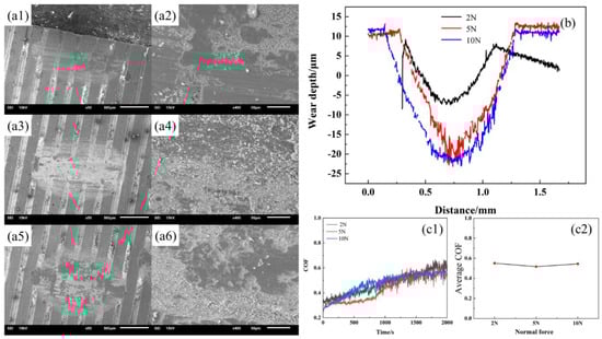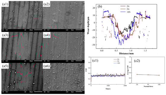 Morphology of Mn-Cu samples with parallel friction direction (a1) T0.3-W0.1-C0.3-2N, (a2) Enlarged view of a1, (a3) T0.3-W0.1-C0.3-5N, (a4) Enlarged view of a3, (a5) T0.3-W0.1-C0.3-10N, (a6) Enlarged view of a5; (b) Wear depth of samples; (c1,c2) Coefficient of friction of samples.