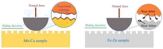 Schematic diagrams of wear mechanism under dry-sliding conditions of Mn-Cu and Fe-Zn woven samples.