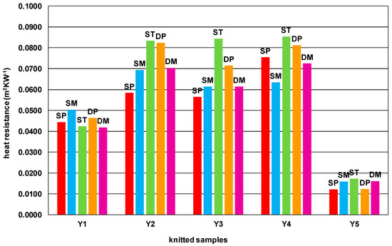 However, the effect of thickness on heat resistance is moderate to strongly correlated and proportional. As the thickness of the knitted fabric increases, the heat resistance increases. Mass per unit area is strongly correlated with heat resistance, more so than thickness (Table 8). It is enough to look at Figure 1 to see that the properties of the yarns have a noticeable effect on heat resistance. The correlation analysis confirms that the correlation coefficient between the linear density of the yarns (Table 2) and the heat resistance of the different knitted fabrics (Table 5) is high for each knitted structure (Table 8).