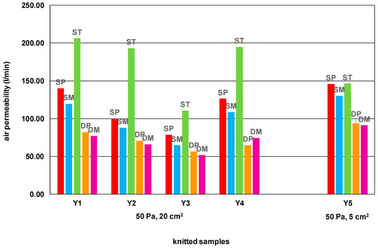 The air permeability of the samples was measured using the air permeability tester Air-Tronic B. The measurements were performed according to EN ISO SIST EN ISO 9237 [42] with a constant pressure drop of 50 Pa. For the samples knitted from yarns Y1 (100% cotton), Y2 (100% wool), Y3 (100% PAN) and Y4 (wool-PAN blend), the test area was 20 cm2. For the sample knitted from Y5 (100% PA filament), the test area was 5 cm2 due to its porosity.