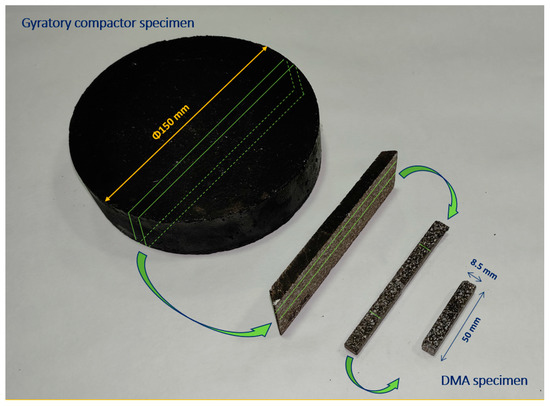 The mixing process between the different components was carried out at 165 °C of temperature. After that, cylindrical specimens with a diameter size of 150 mm were compacted using a gyratory compactor (EN 12697-31) [27] at a temperature 160 °C until reaching a void content near to 0% (which gives way to specimen heights round 40 mm). By reducing to the maximum the air voids present in the material, the adhesiveness between aggregates and binder can be analysed more precisely [14]. Afterward, specimens were sawn using a precision coordinate cutting saw to obtain 8.5 × 8.5 × 50 mm prismatic samples. These would be used in the DMA (Dynamic Mechanical Analyser) characterization without the need to be coupled to the device as in other FAM characterization torsion tests. Figure 2 shows the aspect of the specimens manufactured and Table 5 shows the density of the different mortars manufactured.