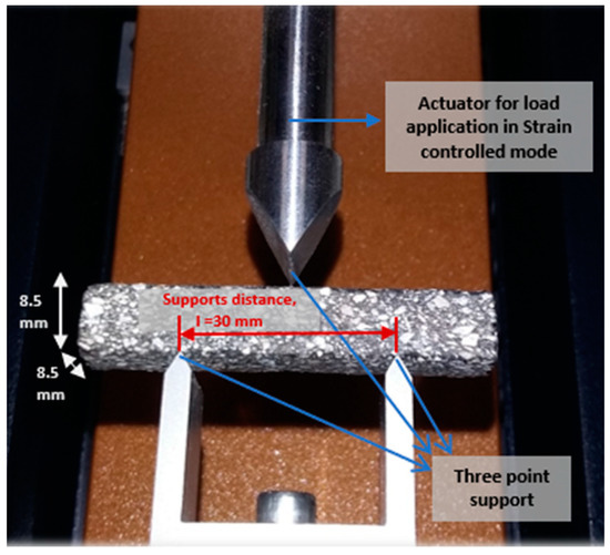 In order to achieve this, a three-point bending test (Figure 3) was performed with DMA Discovery HR 30™ equipment from TA Instruments™ (New Castle, DE, USA) on the prismatic specimens previously referred to. The use of this type of configuration instead of the most commonly used torsional one [12,17,18] allows bringing the material characterization closer to the methods commonly used in fatigue characterization at the level of mixtures such as UGR-FACT [29], 3-point fatigue test [30], and 4 point-bending test [31], among others. This new test allows the assessment of ductility, stiffness, and the fatigue response of the mortar, enhancing the comprehension about the influence of the finest fraction of aggregates and mastic components on the mechanical resistance of the material [19].