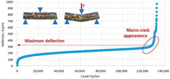 - Maximum deflection (dmax). It is defined as the accumulated deflection in the specimen before the macro-crack appearance (Figure 5). This parameter measures the ductility (ability to deform before cracking) of the material analysed, a property related to fatigue resistance, which is particularly important at low temperatures [34]. As the maximum deflection becomes higher, mortar ductility also becomes higher.