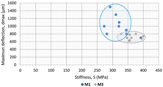 The following figures present the values of Stiffness and Maximum deflection (previously defined) obtained from the nine samples tested for each mortar at different levels of load. The representation of these values allows obtaining a general idea of the mechanical behaviour of the material and the differences that occur due to changes in its composition in terms of bearing capacity and flexibility.