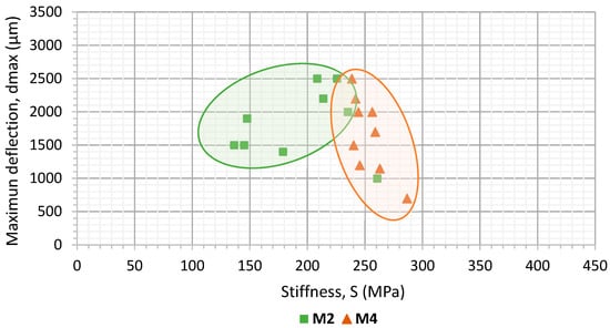 From this figure, it is possible to observe that the design component that most contributes to a higher fatigue life (Nf) is the typology of bitumen employed since mortars manufactured with polymer-modified bitumen (M3 and M4) are the ones with larger fatigue resistance. Regarding the other two parameters, ductility (dmax) and stiffness (S), these manifested an inverse result. Specifically, the higher the rigidity, the lower the maximum deflection. Regardless of this, both parameters were found to be more affected by the type of filler used in the design of the asphalt mixture. Mortars with cement as active filler (M1 and M3) were more rigid than those manufactured using CaCO3 (M2 and M4). Therefore, the former would have a higher bearing capacity and permanent deformation resistance, whereas the latter would present a higher ductility and would be more flexible.