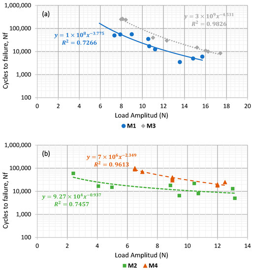 Considering that, as seen previously, the mortars using polymer-modified bitumen in its formulation reached a higher fatigue life. Here, it can be observed that, regardless the kind of bitumen used, the mortars manufactured with cement (M1 and M3) have higher fatigue resistance than those that employed CaCO3 as active filler (M2 and M4). The differences between the fatigue life of the mortars manufactured with different types of filler becomes higher as the load amplitude tested is lower. This could indicate that beyond a certain level of load, the influence of the typology of bitumen would be more significant than the type of filler in relation with fatigue resistance. These results are again in accordance with those found in Figure 6 and Figure 7. This is particularly true when considering that a higher degree of stiffness (such as the one obtained through the use of cement) leads to an extended fatigue life, as it was also pointed out by previous studies [14,37].