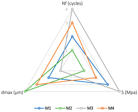 Finally, in order to better distinguish the influence of the of filler and bitumen typologies, Figure 10 presents the relative maximum deflection (dmax) or ductility, stiffness (S), and fatigue life (Nf) together. For each one of these parameters, a ranking between the different mortars was established by assigning a value on the scale 1 to 4 to each one (where 1 is the lowest value and 4 is the largest value). Then, the values were represented in the graph. The ranking is settled according to the average value of each parameter defined at the load of 10 N, as observed in Table 6.