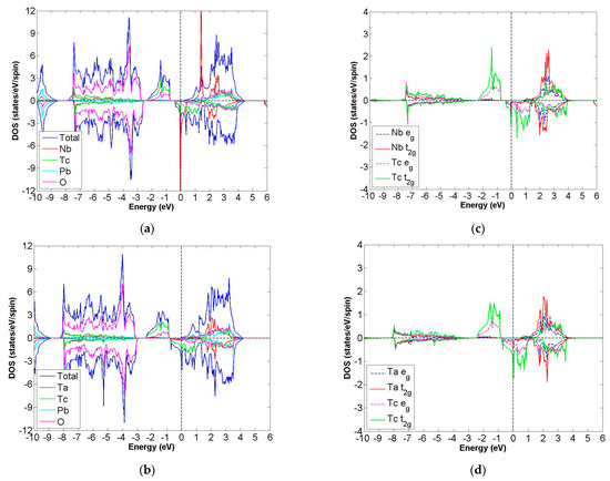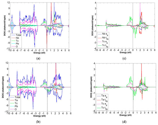 After calculation under the GGA scheme, we find that 13 out of the 24 compounds in the Pb2XX′O6 are categorized as HMs, including Pb2NbTcO6, Pb2TaTcO6, Pb2TiRuO6, Pb2ZrRuO6, Pb2HfRuO6, Pb2VRuO6, Pb2NbRuO6, Pb2TaRuO6, Pb2ZrOsO6, Pb2HfOsO6, Pb2VOsO6, Pb2ZrRhO6 and Pb2HfRhO6. Based on these results, Tc, Ru, Os and Rh are suitable for substitute X′ site element, and we follow this order to systemically discuss all possible HM candidates. For clearer description with the GGA scheme, Figure 3a–d describe the DOS of Pb2NbTcO6, Pb2TaTcO6 and PDOS of d-orbital in Pb2NbTcO6 and Pb2TaTcO6, respectively. In comparison with these figures, Figure 4a–d illustrate the same compounds just under the GGA + U scheme. Following the figure arrangement of GGA and GGA + U, Figure 5a–l and Figure 6a–l, Figure 7a–f and Figure 8a–f and Figure 9a–d and Figure 10a–d illustrate the DOS and PDOS of Pb2XRuO6 (X = Ti, Zr, Hf, V, Nb and Ta), Pb2XOsO6 (X = Zr, Hf and V) and Pb2XRhO6 (X = Zr and Hf), respectively.