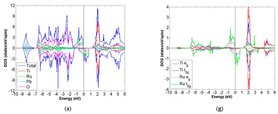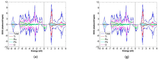 As seen in Table 1, mtot for Pb2TiRuO6, Pb2ZrRuO6 and Pb2HfRuO6 are 2.000 μB/f.u., but those of the others are maintained at 1.000 μB/f.u. Even though their values are not the same, all of them are FiM-HM materials because their mtot are integers except zero. The other evidence for half-metal property is provided by Figure 5a–l. The band gaps of these compounds only occur in the spin-up channel, while the spin-down channel is conductive.