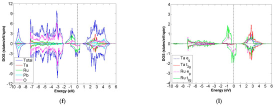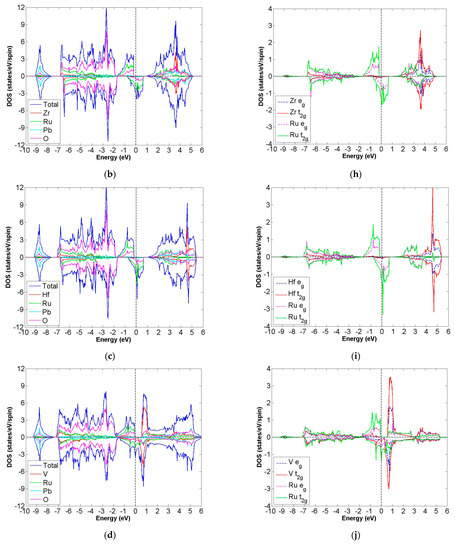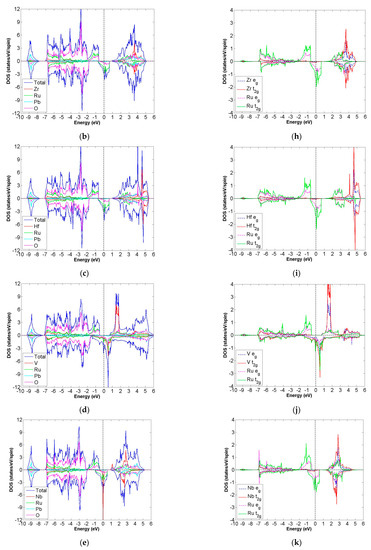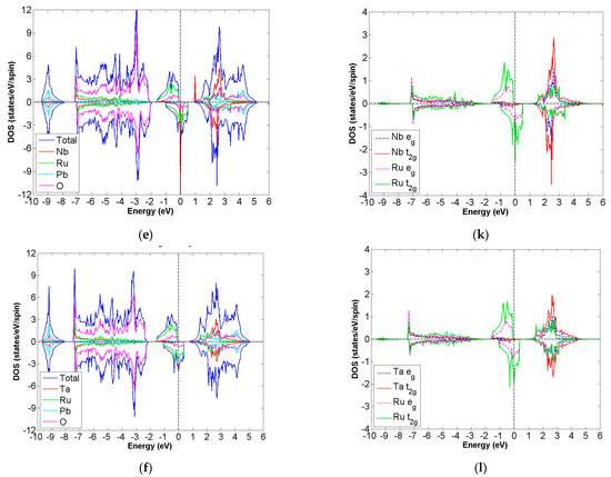 Based on the GGA calculation, the calculated total and partial DOS values of (a) Pb2TiRuO6, (b) Pb2ZrRuO6, (c) Pb2HfRuO6, (d) Pb2TiRuO6, (e) Pb2ZrRuO6 and (f) Pb2HfRuO6 and partial DOS of eg and t2g spin orbitals for (g) Ti and Ru, (h) Zr and Ru, (i) Hf and Ru, (j) V and Ru, (k) Nb and Ru, (l) Ta and Ru.