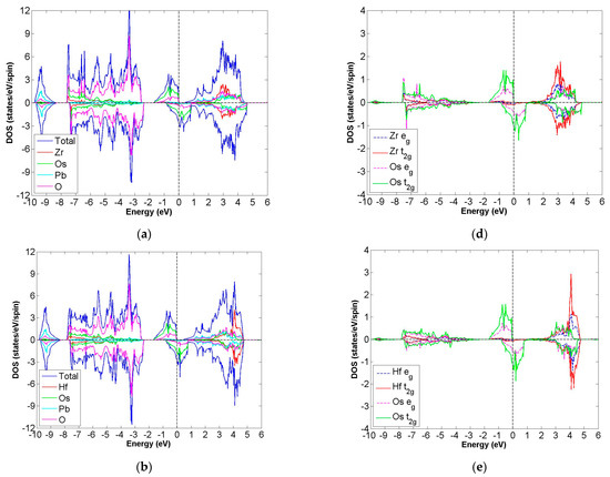 Under GGA + U (U of Zr, Hf, V and Os set up as 2) schemes, the calculated total and partial DOS values of (a) Pb2ZrOsO6, (b) Pb2HfOsO6 and (c) Pb2VOsO6 and the partial DOS of eg and t2g spin orbitals for (d) Zr and Os and (e) Hf and Os and (f) V and Os.