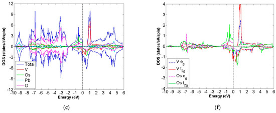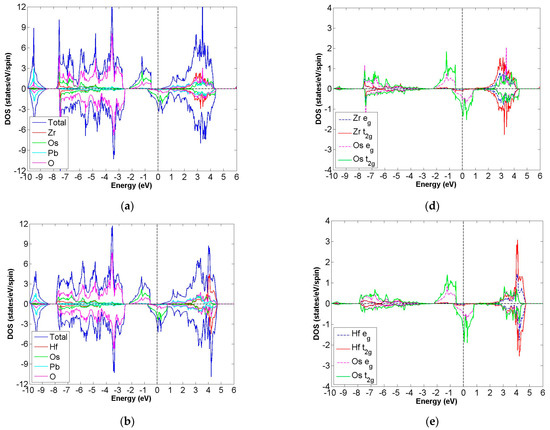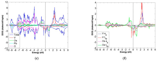As seen in Table 1, mtot for Pb2ZrOsO6 and Pb2HfOsO6 is 2.000 μB/f.u., and mtot for Pb2VOsO6 is 1.000 μB/f.u. Table 1 also shows the energy gaps for these compounds, which are 0.38, 0.47 and 0.65 eV. When we refer to Figure 7a,b, a few electrons occupy the energy range of 0.5 to 1 eV, so this phenomenon makes the band gaps of the group compounds narrower than others. These results also provide direct evidence indicating that these compounds belong to the FiM-HM family.