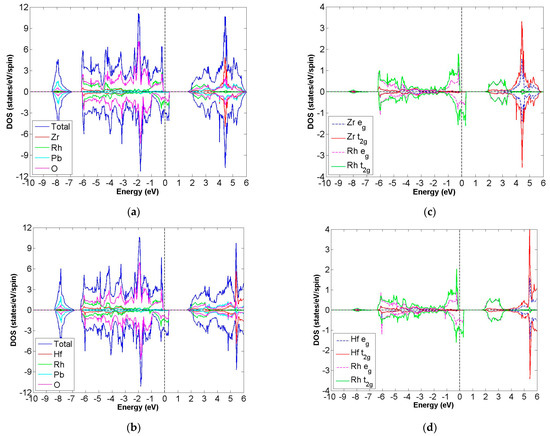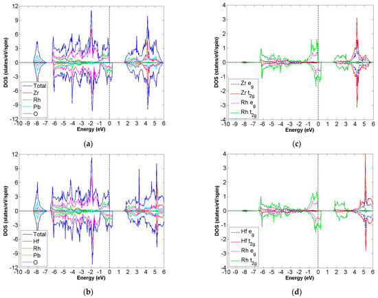Based on the GGA calculation, the calculated total and partial DOS values of (a) Pb2ZrRhO6 and (b) Pb2HfRhO6 and partial DOS of eg and t2g spin orbitals for (c) Zr and Rh and (d) Hf and Rh.