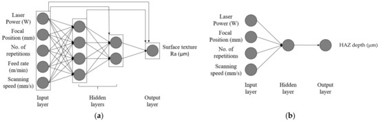Section 2.5.2, the ANN design for surface roughness is composed of two hidden layers of four and two neurons, respectively, with a cascade forward network structure. A simple feedforward network architecture with one hidden layer of one neuron forms the ANN design for the HAZ depth. The Levenberg–Marquardt backpropagation algorithm, also described in