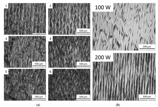 Figure 6b), with the only difference in the laser parameters between them being the laser power, the surface of the sample treated with higher power presented more homogeneous structures. The ripple form on the surface was elongated with the increased laser power from 100 W to 200 W. The borderlines of the scan tracks of the latter are more distinct than those on the former. It indicates that a more effective fusion occurred between the adjacent melt tracks when irradiated by the laser spot with a power of 200 W.