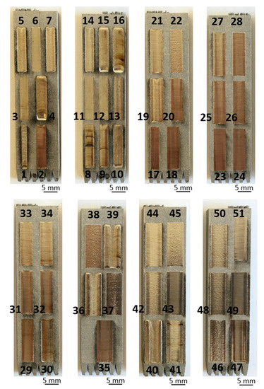 Figure 8. As seen in the pictures, varying the parameters in accordance with the DoE adopted led to a significant diversity of surface topographies with varied quality. Cases of overheating, insufficient remelting, and surface flattening can be easily noticed. Surface roughness quantitative results were obtained via the tactile measurement as formerly described in