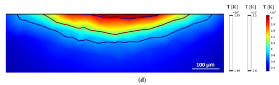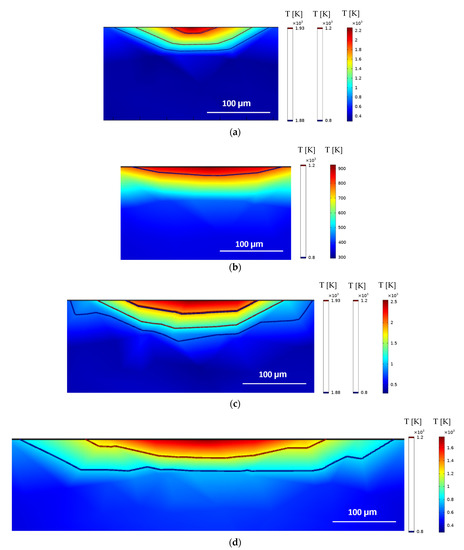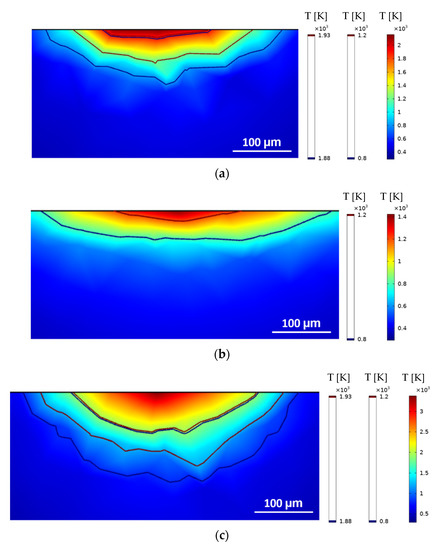 Figure 6 when the power is increased from 200 W to 400 W. Another evident aspect of using different sets of parameters that was accurately captured by the heat-transfer model is the laser–material interaction area and maximum temperatures achieved for different focal offsets. For 200 W with a +3 mm defocus, the maximum temperature achieved was slightly above 900 K and the contour delimitating the melted zone could not be identified, which implies that the intended remelting was not satisfactorily accomplished. For the same laser power and a lower defocus of +1 mm, the maximum temperatures achieved were above 2200 K, and the HAZ and melting contours are clearly identifiable. When maintaining the focal offset of +1 mm and increasing the power to 400 W, the HAZ contour presented was sharper but clearly deeper and broader, although the maximum temperature achieved was above 2500 K and did not represent a great increase. Finally, with 400 W and +3 mm, the effect of the defocusing on the laser beam diameter and the laser intensity distribution can be observed with the increased laser–material interaction area and reduced maximum temperature and HAZ depth.