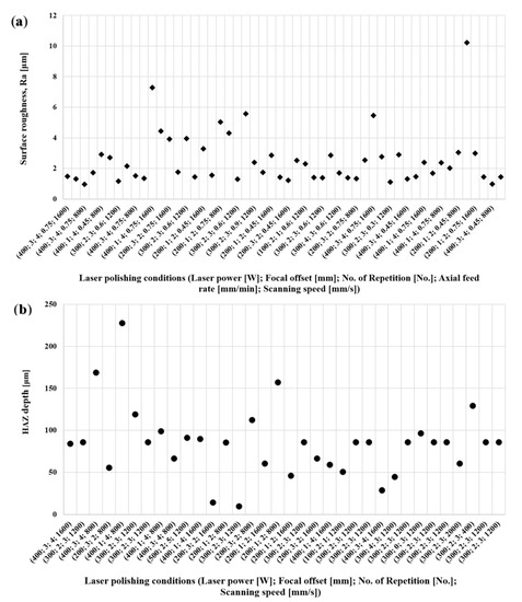 Table 4 the focal offset is 3.99 mm (~4.0 mm) and is constant for all optimal solutions. On the other hand, parameters such as laser power, number of repetitions, and scanning speed present opposing behaviors to achieve minimum Ra and HAZ depth. In this aspect, the multiobjective optimization developed a balanced solution that consisted in combining high scanning speeds and a low number of repetitions, which tend to minimize the HAZ depth values, with laser power values closer to the optimal range to achieve minimum Ra.