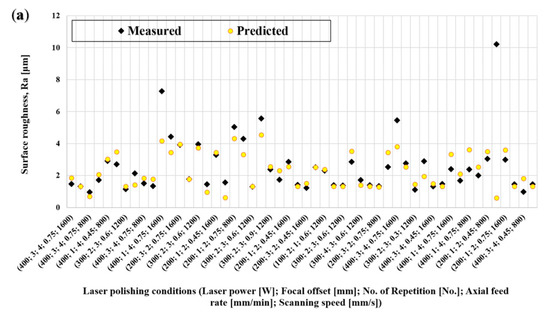 This section addresses the development of the linear regression models for Ra and HAZ depth based on the experimental data obtained from the DoEs described above. It includes coefficient estimation, parameter interaction, and prediction capability of each model.