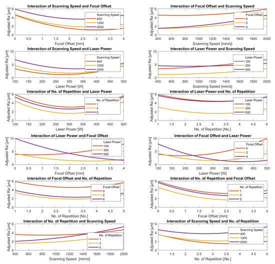 Figure 13 show the clearest relation was between adjusted Ra and scanning speed; the lower the speed, the lower the value of the adjusted Ra for all values of power, the number of repetitions, and focal offset. There is also a clear tendency for the adjusted Ra to decrease as laser power increases with a broad minimum clearly visible around 300 W for both scanning speed and the number of repetitions, though the position of the minimum does tend to increase slightly with speed. However, minimum adjusted Ra is sensitive to change in focal offset. Minimum Ra occurs at higher values of the power the greater the value of the focal offset; for example, for the minimum value of the focal offset (0.0 mm), the minimum adjusted Ra occurs at a laser power of 100 W, but at the maximum value of the focal offset (+4.0 mm) the minimum adjusted Ra occurs at a laser power of 425 W.