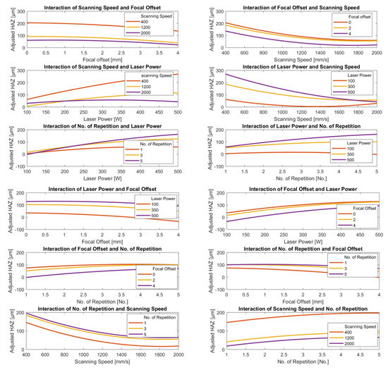 Figure 14 show that the estimated depth of the HAZ clearly decreases as laser power decreases and scanning speed increases for all values of focal offset and laser power and the number of repetitions, with the one exception that at the minimum power, 100 W, we observe a shallow “U” shaped curve with a minimum at about 1400 mm/s. The depth of the HAZ decreased slightly as focal offset increased but increased slightly as the number of repetitions increased, except in the case of higher power levels.
