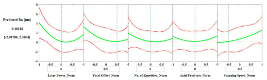 The slice plots allow the assessment of the predicted values of Ra and HAZ depth for a chosen set of parameters. For example, to obtain a laser polished surface with a Ra value of around 0.51 μm, the suggested set of parameters are: laser power = 0 (300 W), focal offset = 0.5 (+3 mm), number of repetitions = 0 (3 repetitions), axial feed rate = 0 (0.6 m/min), and scanning speed = −0.5 (800 mm/s). The same set of parameters would result in a HAZ depth of around 110 μm.