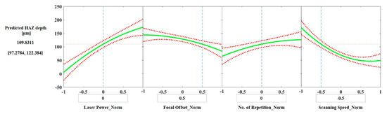 48]. The regression model for surface roughness has only the focal offset and the scanning speed statistically relevant at the 95% confidence level, the former being slightly more significant than the latter. The confidence levels for the axial feed rate, the number of repetitions, and the laser power were very low. However, the previously mentioned study resulted in a much better fit for the surface roughness model and showed the same order of parameter relevance as observed for the HAZ depth in the current work [