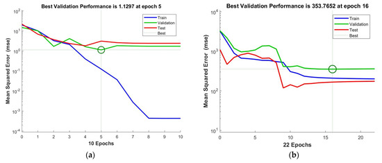 Figure 17. The performance is evaluated based on the MSE computed in every epoch. In most cases, during the training stage, the MSE has a tendency to decrease with the number of epochs executed. While the same is true for the validation stage, an increase in the MSE can occur if the network starts overfitting the training data. In order to avoid overfitting, the MATLAB ANN toolbox stops the training at a specified number of consecutive increases in the validation MSE; by default, this number is six. Overfitting can also be detected if the test MSE experiences a significant increase prior to the validation curve. As seen in